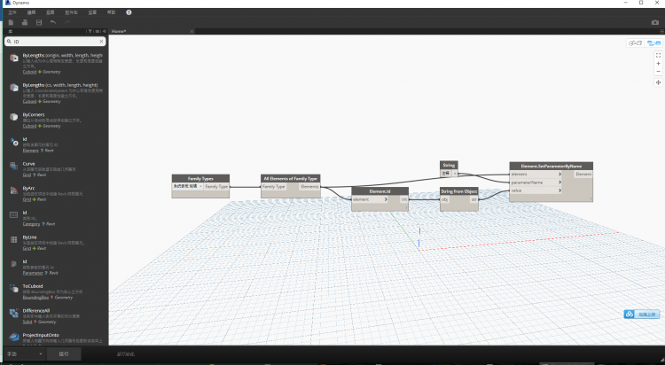 3、在DYNAMO中输入以下节点并串联起来,然后点击运行。然后可以鼠标移到上方观察出节点作用,在这里不多做赘述。我这里将图元ID 写进了注释中。