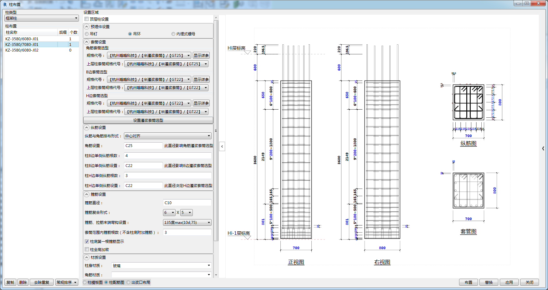 目前仅支持框架柱一种柱类型,柱布置时应先对灌浆套筒进行选型。支持出浆口一键布局。