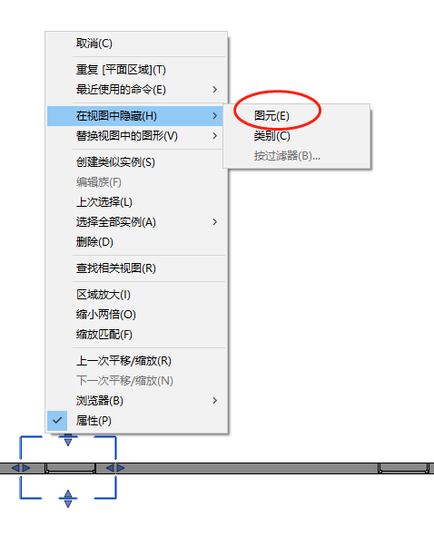 5.选中“平面区域”的矩形框,点击“在视图中隐藏”中的“图元”,如图所示。