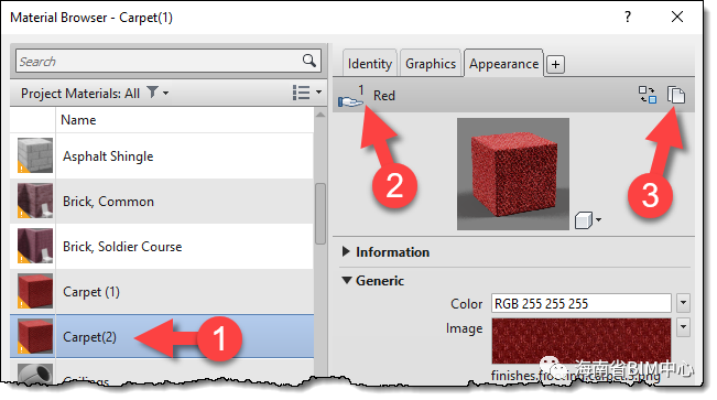 很多同学在Revit材质编辑器中,想复制出自己项目需要的材质,结果发现修改后的材质竟然也影响到了原来的材质,比如想要两种不同颜色的地毯,结果怎么修改都是一种颜色。下面以英文版的REVIT为例,通常的步骤如下: