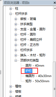 新建一个项目,把创建好的轮廓族载入项目中,同时在项目浏览器族中找到栏杆扶手,在顶部护栏类型处复制一个,修改名称为“护栏”,如图所示。