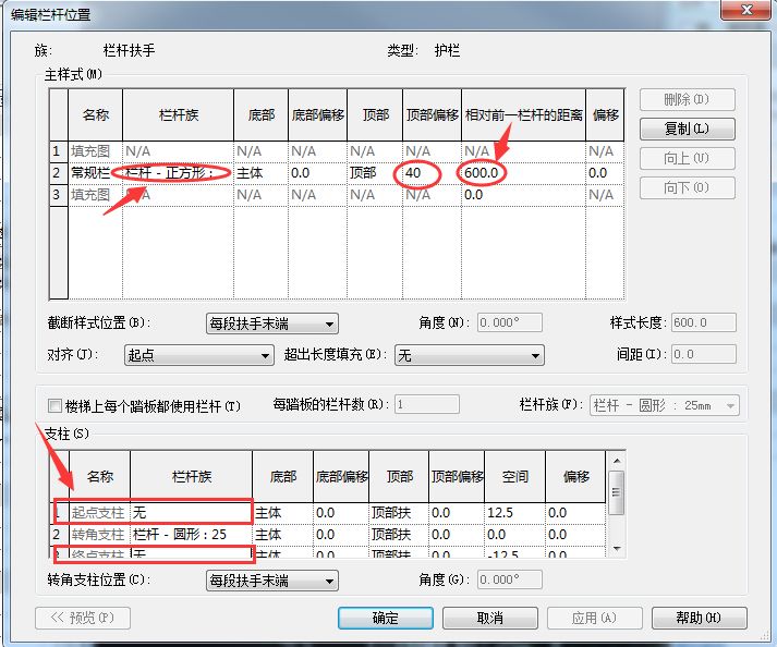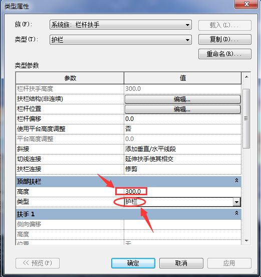 双击打开“护栏”,在弹出的顶部扶栏“类型属性”对话框中,将轮廓修改为创建的“护栏”轮廓族,调好护栏的高度,如图所示。