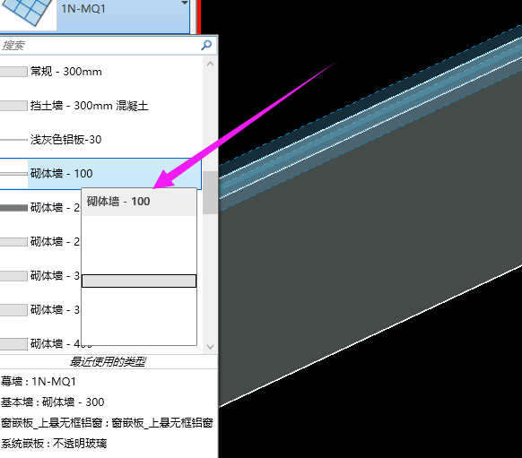 2、将拆分幕墙部分选中,修改其图元属性,将其该处墙体,如图所示。