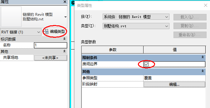 1、选中链接模型,编辑类型,勾选房间边界,如图所示。