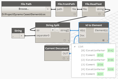 如果我们由一组用逗号分隔的ID,保存在一个文本文件里,那么下面的Dynamo项目就可以把ID分离出来,并且取出对应的项目中的图元。