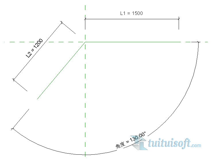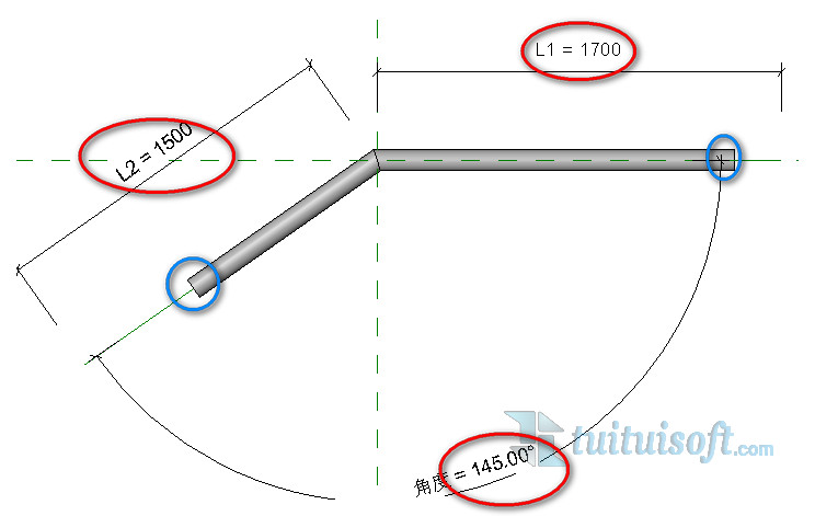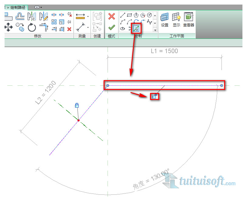 这里之所以只标注L1,是因为之前我们在设置工作平面的时候我们设置的是L2那一参照线的工作平面,所以当我们拾取锁定L2那一段的时候,那一段的放样路径会和L2匹配长度,但L1不会,所以我们要进行L1段的标注。