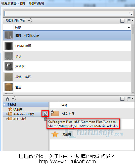 答:将鼠标放置到小锁位置就可以显示出材质库文件的位置!