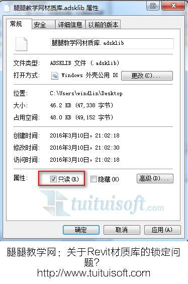 答:找到自建材质库文件,右键——属性——勾选“只读”,那么材质就被锁定了!