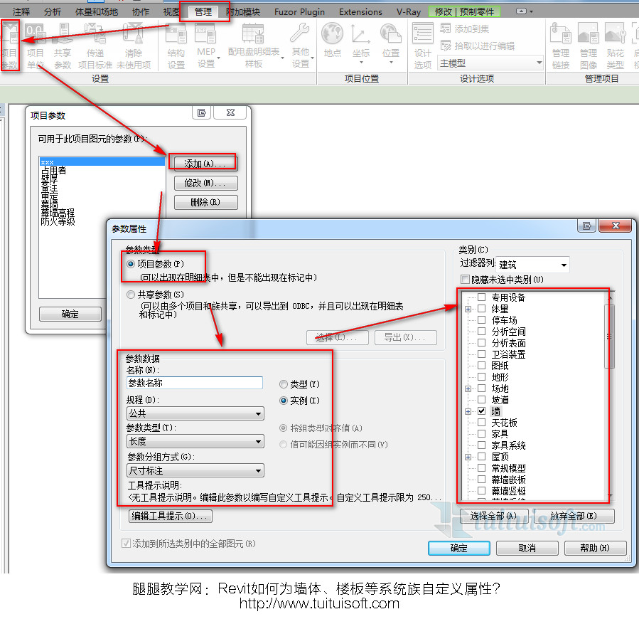 通过项目选项卡下面的项目参数可以为系统族增加自定义属性!