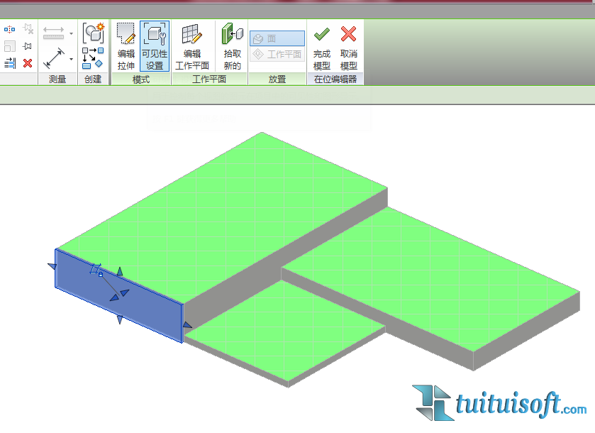设置一个侧面为参照平面,在这个面对应的立面中使用拉伸绘制一个轮廓,设置好厚度及添加材质参数,并在族类型面板中添加材质