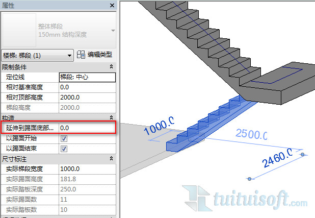 选中楼梯,在类型属性的构造中找到“延伸到基准之下”,输入适当的负值即可