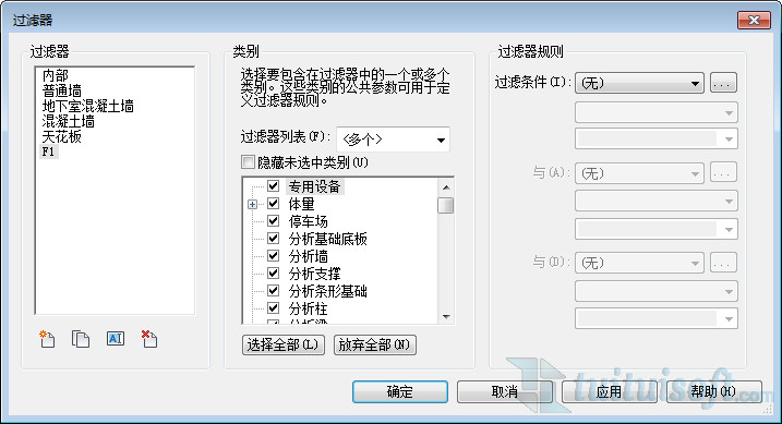 过滤器的触发条件有两个:一种是选择构件,在工具面板中即出现过滤器,用于批量选择多种类型的图元;还有一种是输入快捷键“VV”,在弹出的可见性对话框中会出现过滤器,当然也可以在视图面板中调出对话框。后者的设置更加灵活,相当于可以自己设置筛选条件,以及自己定义符合筛选条件的内容。