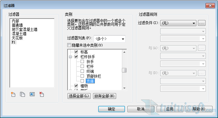 在类别中选择过滤器需要应用的对象。因为我们建的一般为建筑结构模型,所以选择这两项,在下方单击选择全部。