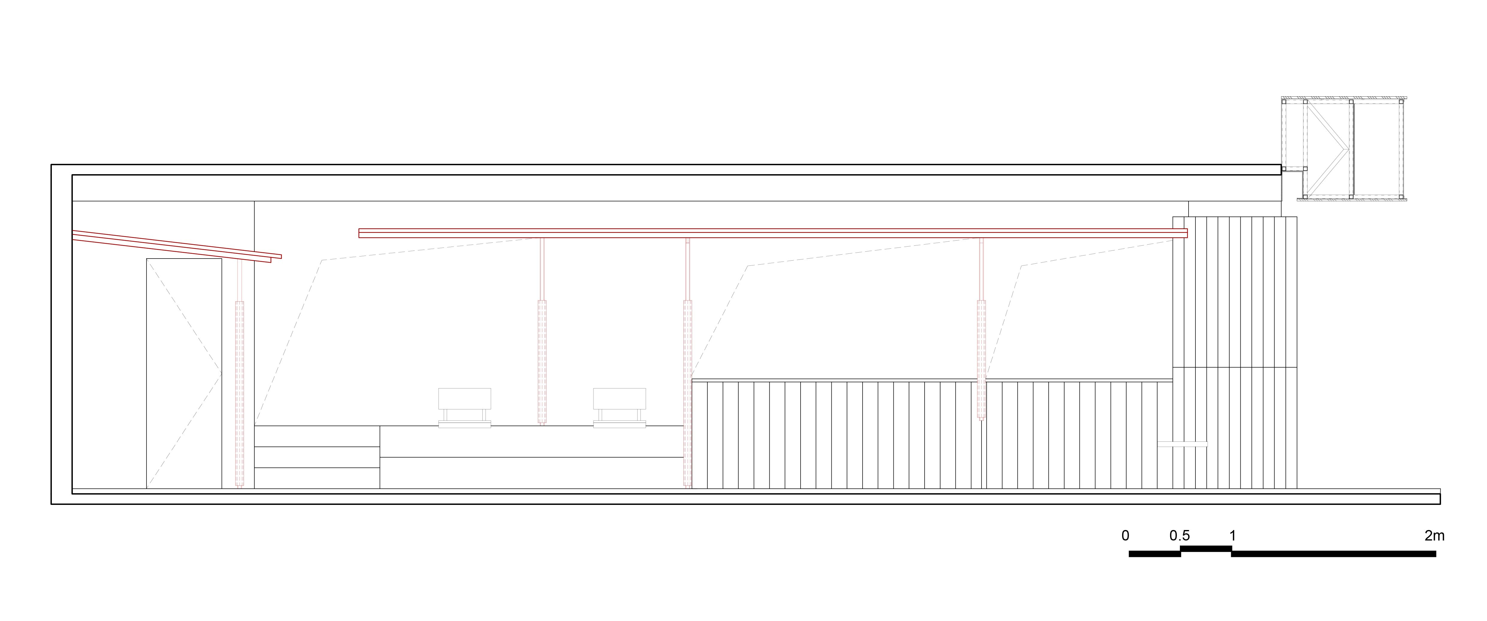 室内共出现两处雨棚,一处是吧台区,也是咖啡店能有公园感的核心要素;一处是在双人座位区,单坡雨棚在空间中划定了一个相对私密的区域,檐下立柱的存在强化了空间的构造秩序。