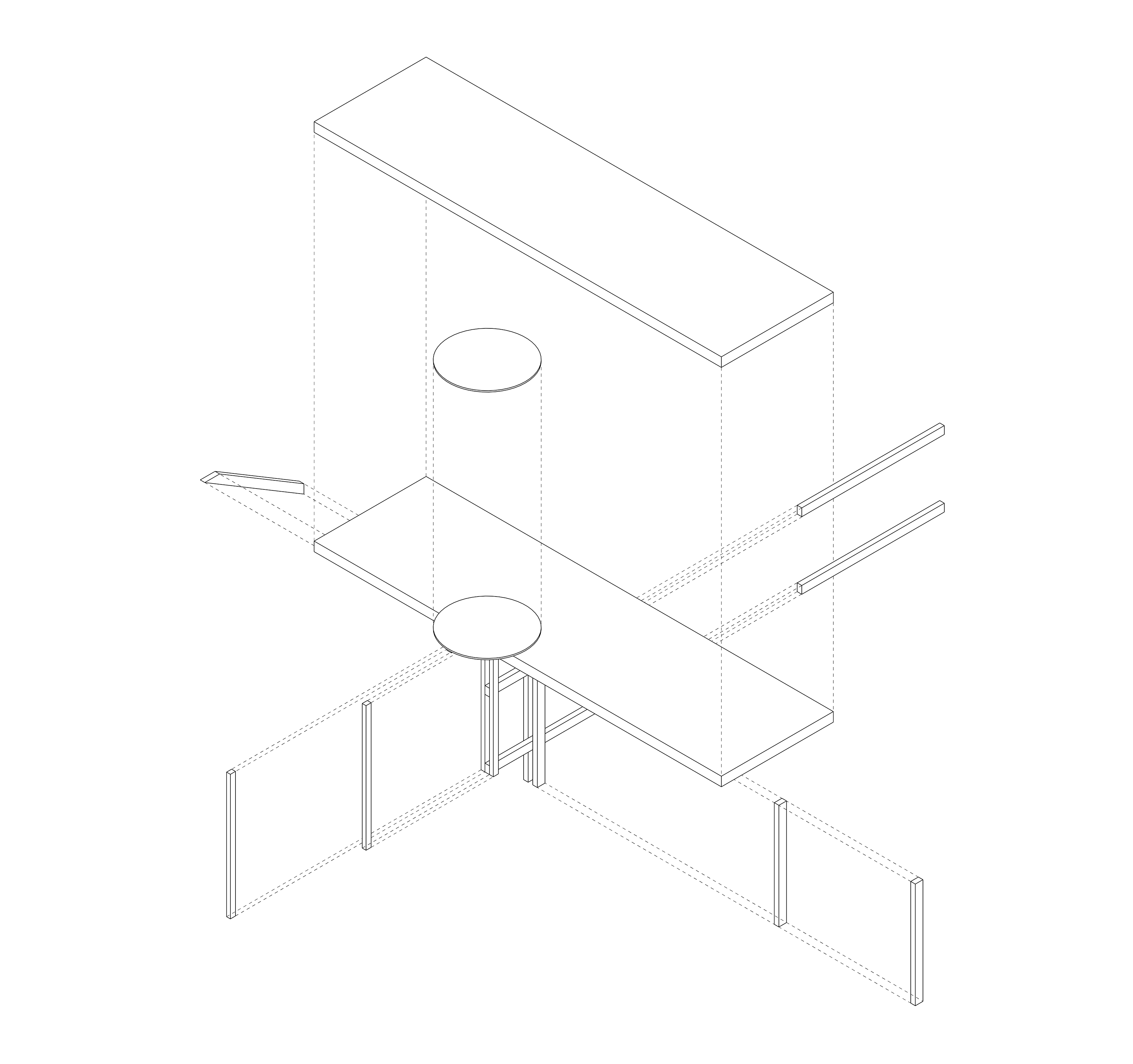 为了解决这两个问题,我们依空间走势把吧台放置在平面中心。作为最核心的体量,吧台整体由老木板包裹来回应原始肌理的历史感。竖向柜体将木柱结构消化掉,点餐台的开口避免了柜体太长而产生像墙一样的分隔。在柜顶贴近天花的位置,我们将木柱和梁的端头裸露出来,展现了结构真实的同时,老木头的色泽和气味也为空间提升了时间沉淀的质感。