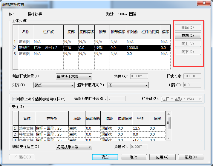 右排操作选项:可以对常规栏杆进行复制以、移动以及删除