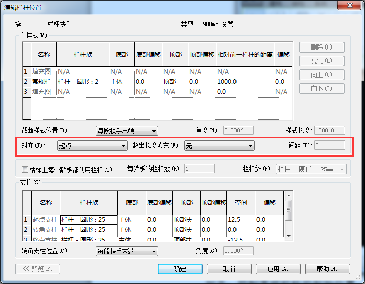 对齐:控制常规栏杆的起始位置,起点就是从起点处开始排列,以此类推