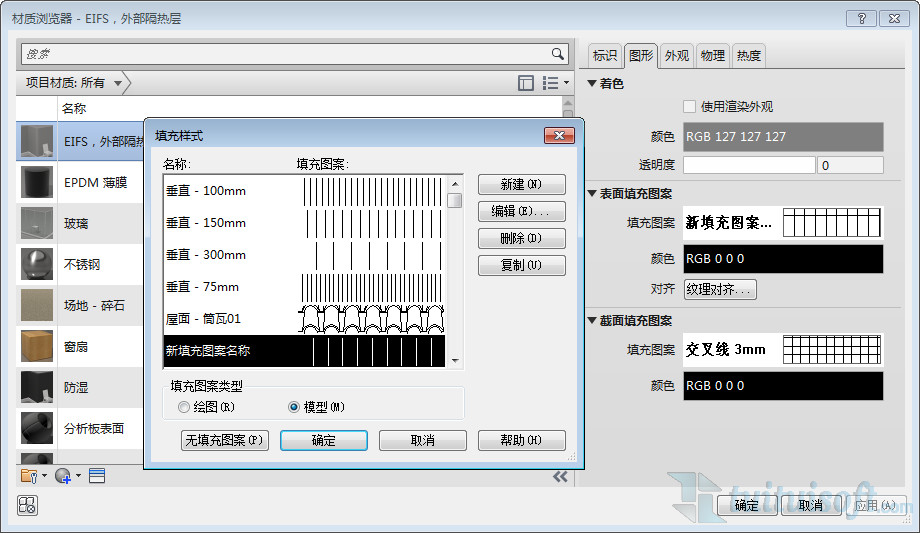 选中绘制好的构件,在类型属性结构编辑一栏材质选项中,可以看到表面填充图案的编辑选项,可以选择系统自带的填充图案,也可以自己绘制简单的图案或者将已经绘制完成的图案导入进来。