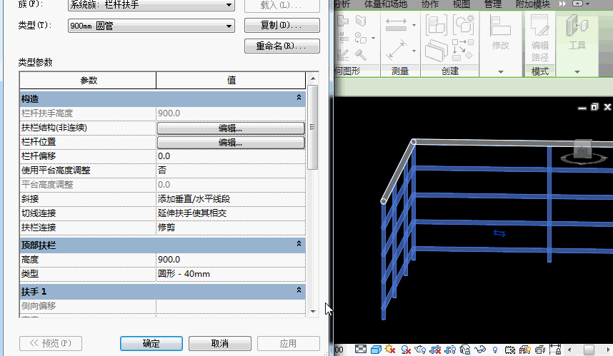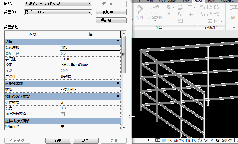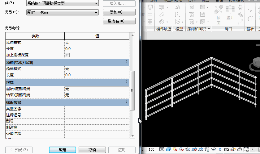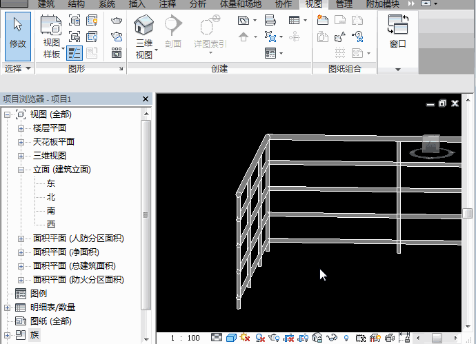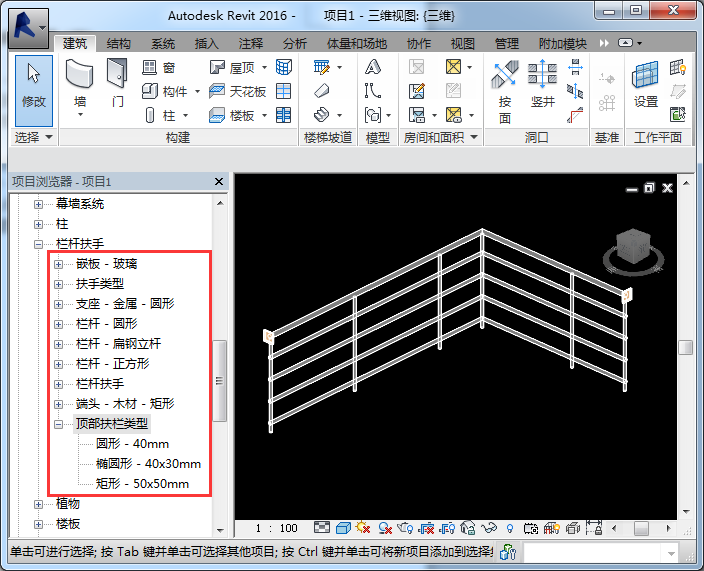 这时候,我们就要进入族进行修改,首先我们知道了顶部扶栏的类型是40mm圆形,接着我们打开项目浏览器进行修改