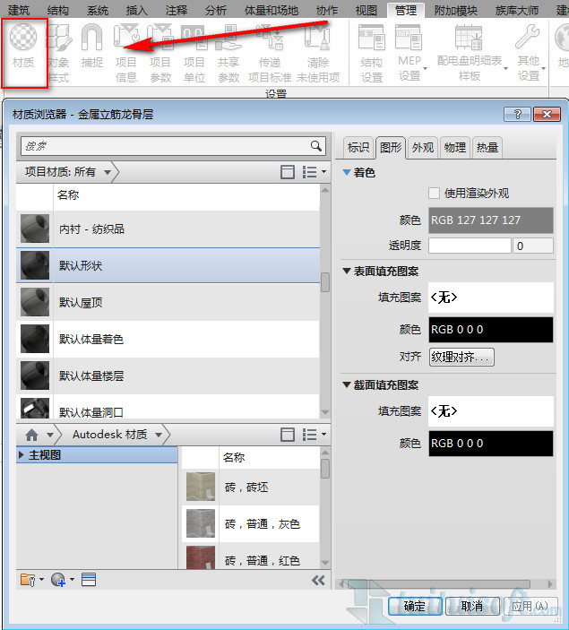 2、接下来添加相应的材质,在管理选项卡下选择“材质”,进入材质浏览器中,新建材质,材质名称可以根据系统类型进行命名。
