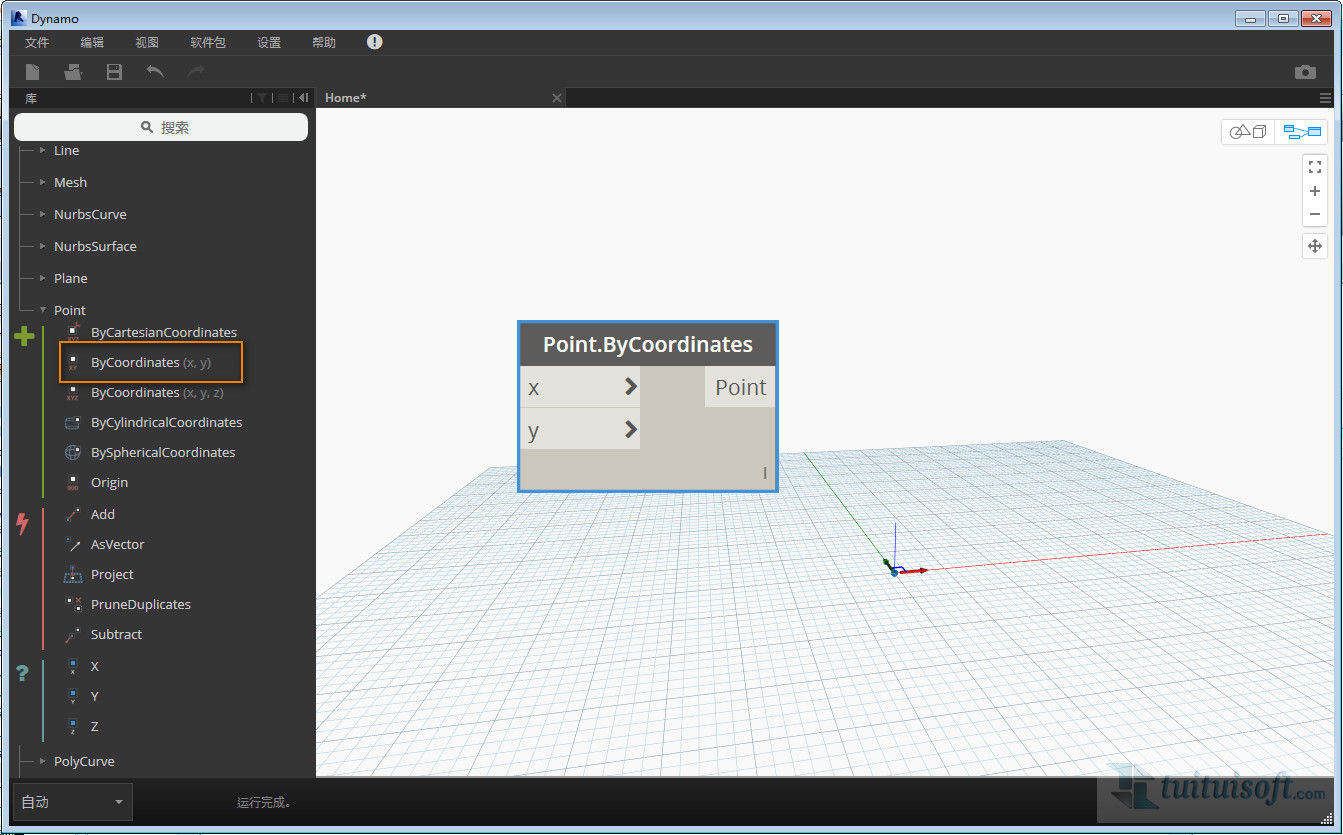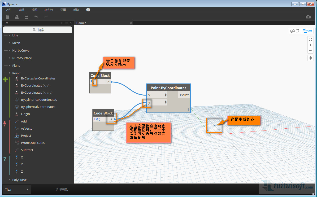 在Dynamo中你无法直接手动绘制一个点或者一条线,你只能用导入,或者编码的方式生成你想要的模型