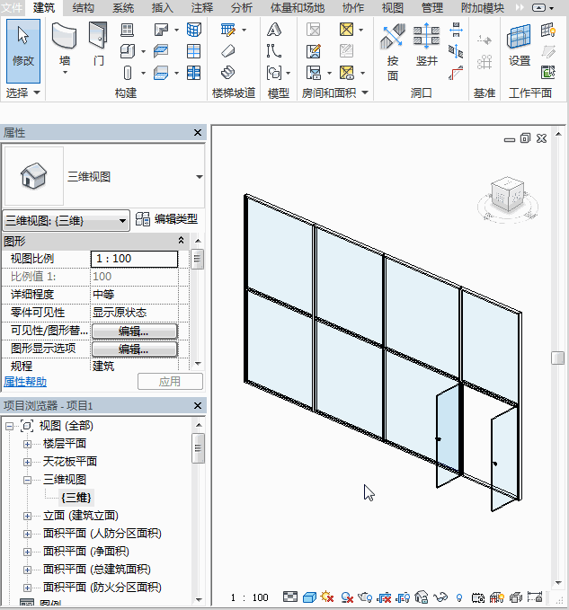 第二种方法:将幕墙嵌板修改为常规墙体,然后在进行门族的放置,这种方法比较简单,其中墙体的大小可以通过调整幕墙网格的规划来进行调整