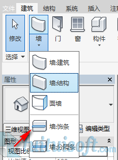 接下来把绘制好的踢脚线形状载入项目中,在三维视图中选择建筑墙下拉栏中选择“墙饰条”: