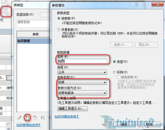 在属性栏里点击“族类型”新建参数命名为“贴图”