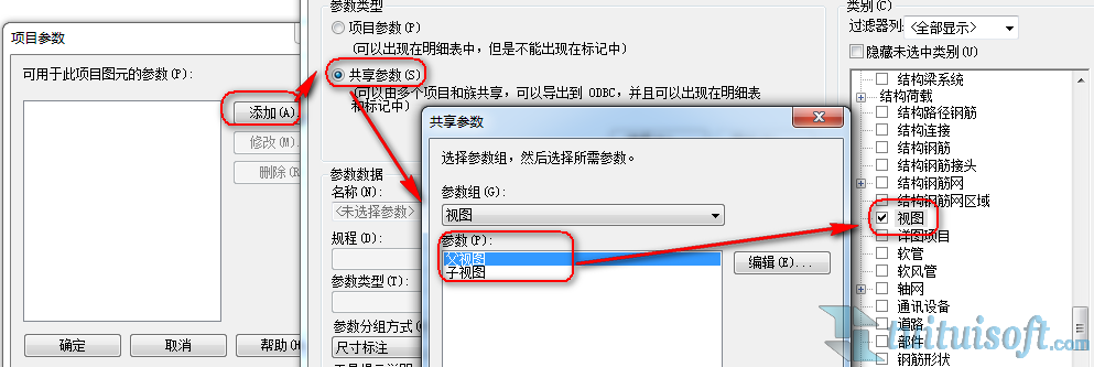 第二步:新建项目参数,在管理工具栏里点击“项目参数”把之前做好的共享参数进行添加。(注意:在过滤器列表的隐藏类别中选择的是“视图”)
