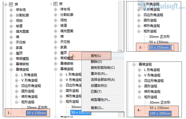 将这个轮廓族载入到项目中,接着就可以使用它来定义幕墙竖挺了。由于转角竖挺的轮廓是不可自定义编辑的,因此,在幕墙类型的选择中我们选用的是矩形竖挺这个和新建轮廓比较类似的竖挺类型。