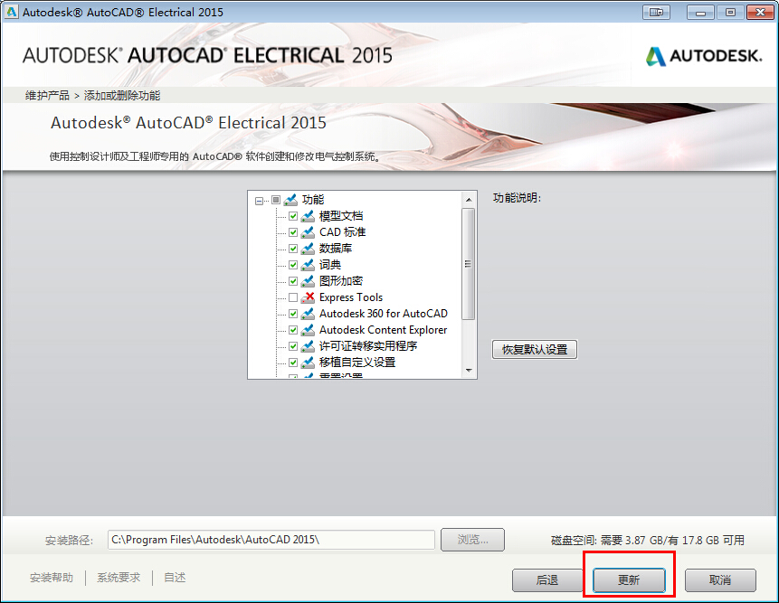 3、在“AutoCAD Electrical 安装向导”中,单击“添加或删除功能”。