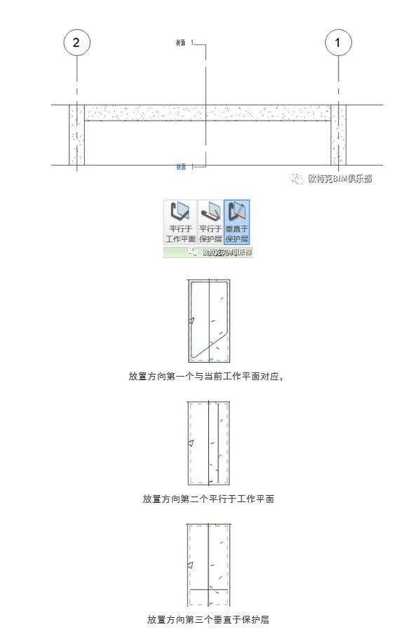 在这里,有三个放置平面,其中,第一个主要是在剖面中绘制使用。第二个近保护层参照绘制离你最近的主体面内内向远开始绘制,第三个,顾名思义,绘制离你最远的主体平面内向近开始绘制。