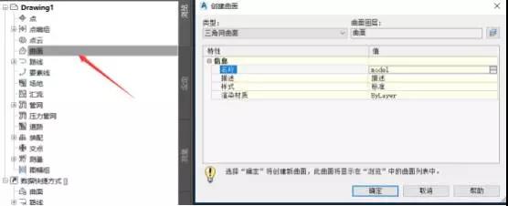接下来,打开Civil 3D,右击选择“曲面”——“创建曲面”,类型选择“三角网曲面”,可将此曲面的名称进行重命名。
