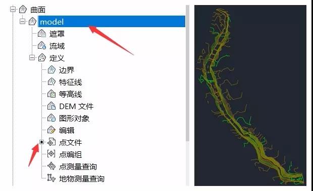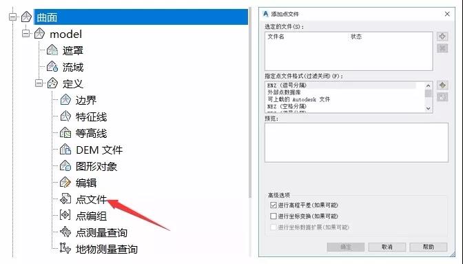 点击“确定”之后,曲面的选项栏左侧边会出现一个小加号,这个说明创建的曲面已经形成。点击加号,就会出现自己命名的曲面,需要注意,这个曲面并没有赋予任何信息,还未添加已经准备好的点文件。接下来,在点文件选项栏右击,选“添加”,然后点击“+”,找到已经准备好的txt文件进行添加。添加完成后点击“确定”,则该文件被添加进来了。