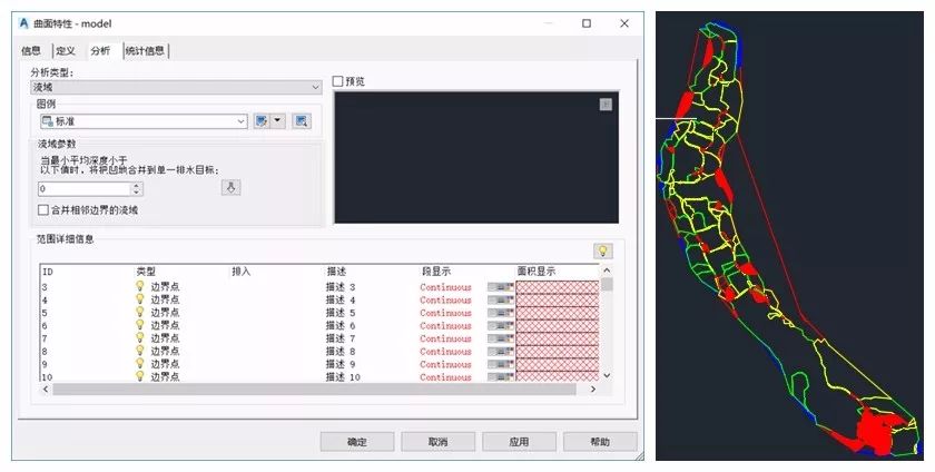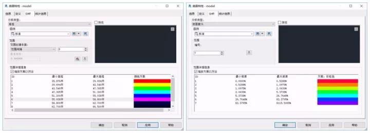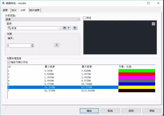 范围编号选择输入,然后点击向下箭头,则会生成相关符合要求的方案,这里,可以人为修改最小坡度、最大坡度;同时,还可以修改配色方案,如果色差明显,就不太美观。
