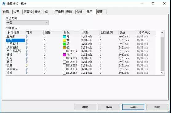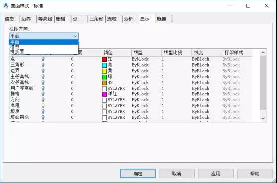 选中要分析的曲面,右击——曲面特性,找到分析选项卡,可以看到分析类型包含7种,常用的是坡度,高程,坡面箭头,流域的分析,其他三种大同小异,不做描述。
