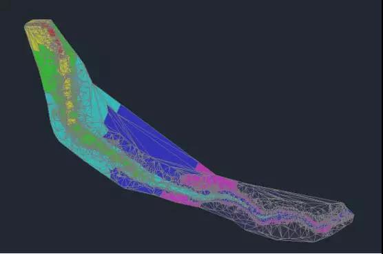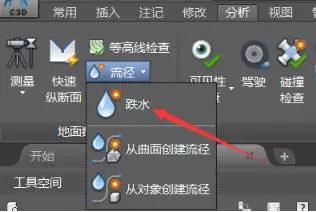 在流域方面,使用曲面三角网线来表达的水在曲面上流过的区域,跌水即水流经曲面的路径。跌水分析时,鼠标在曲面上点击跌水起点位置,则软件自动生成以该处为起点的跌水路径。当选取多点时,可生成多条跌水路径。选择跌水,