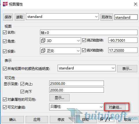 点击确认之后,会出现之前的对话框,这时发现在可见对象组当中就有了创建的过滤器“只见柱”,若是想取消隔离的话,也是在对象组当中选择“standard”