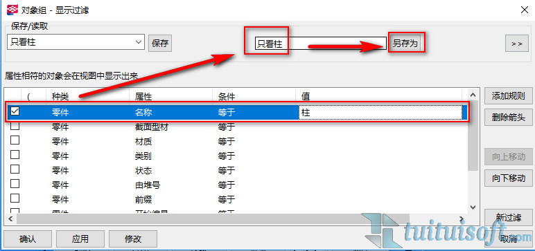 选择“对象组”之后出现“对象组-显示过滤”对话框,在这个对话框当中可以通过之前设置的柱属性对话框当中设置的参数来进行过滤显示隔离。好比如:这边选择的是在“零件-名称”这栏当中“输入构件的名称为柱子”,接着保存这个过滤器并给一个名称,比如“只看柱”接着点击“另存为”,最后点击“修改与应用”