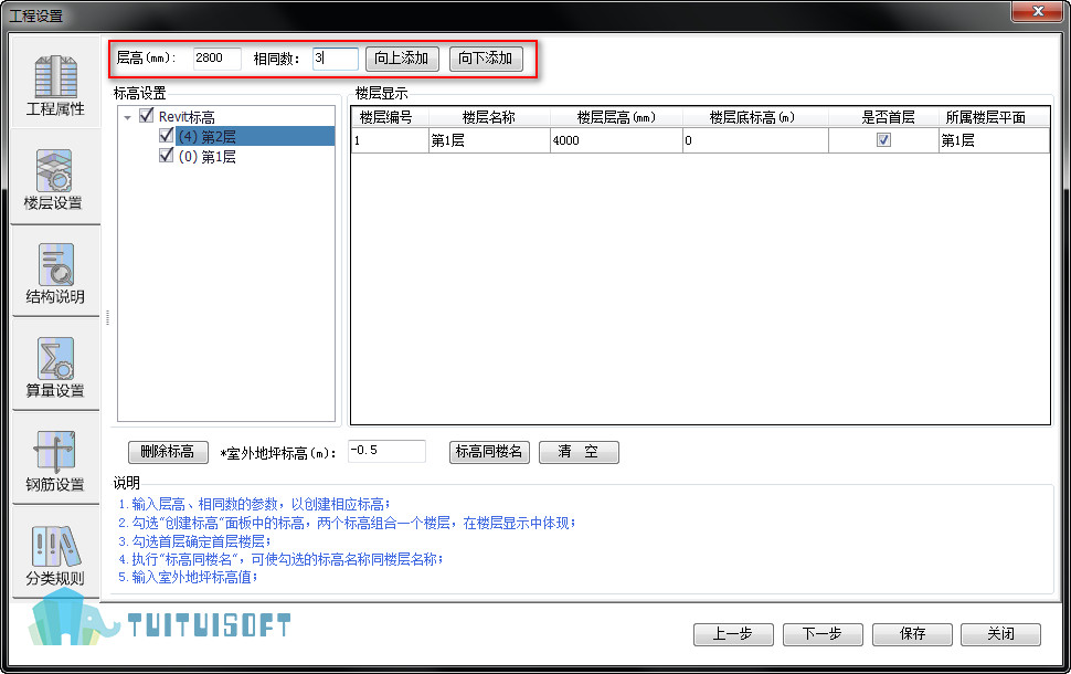 楼层设置是用于建立工程的实际楼层的层数和层高,根据图纸要求建立标高,通过两个标高的建立形成一个楼层的概念,按照从下到上的顺序依次添加。