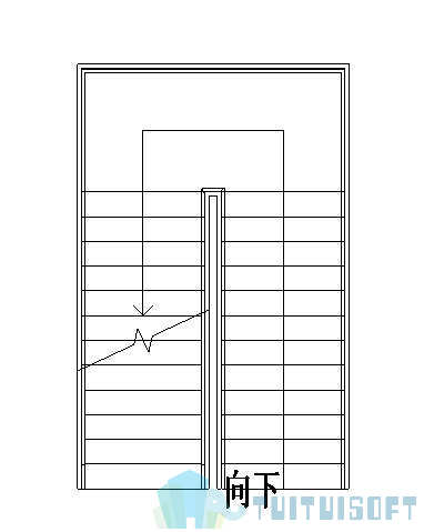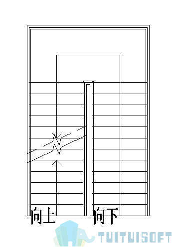 使用默认设置绘制楼梯时,在中间楼层时,楼梯按如图1.4楼梯中间楼层所示,这时候,高于楼梯的虚线表示已经不会对楼梯的显示产生干扰,但是此时的楼梯标记与施工图表达中存在差异,需要进行调整。