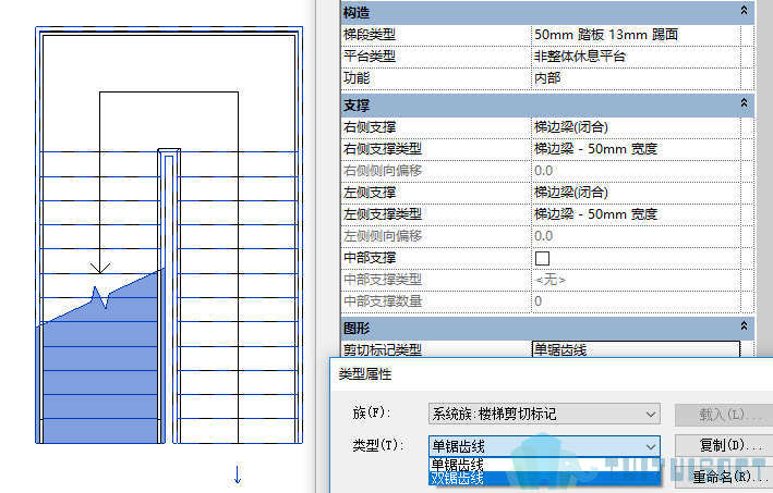 选中楼梯之后,在楼梯的类型属性的图形中,将剪切标记类型修改为双锯齿线,如图1.5所示,单击应用之后,可以看到楼梯的剖断号已经变为双剖断,但是此时的剖断标记由于一边是高于剖切面的,所以一边的剖断线会表示为虚线,如图1.6所示,此处无法通过设置进行修改。