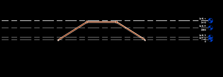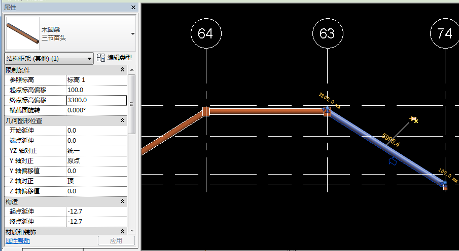 在立面中可以看见在不同标高中的构件没有经过调整是无法连接的。此时,点击构件查看属性,我们可以通过调整起点标高偏移和终点标高偏移,来实现处于不同标高的构件间的连接。