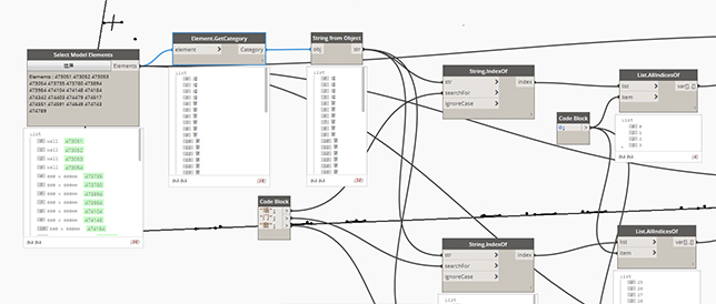 在这里先对整体项目进行选中,从中对墙,门,窗进行划分,方便后面进行划分整理,由于墙体需要特殊的节点进行读取,所以对整个构件的族进行处理,同时应用String.AllIndicesOf,String.IndexOf节点进行选取选取。