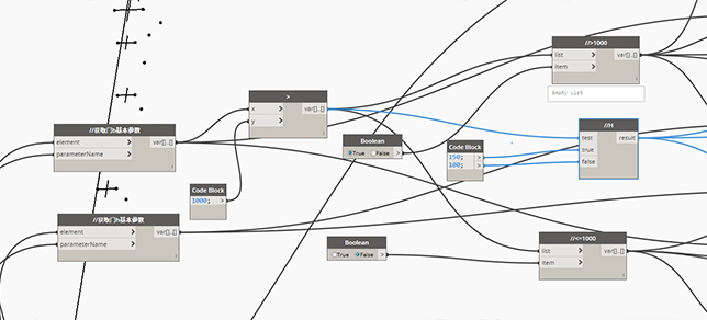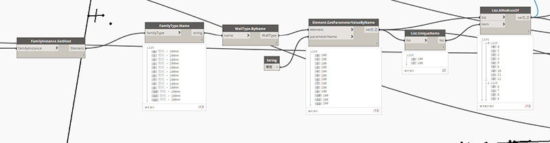 使用FamilyInstance.GetHost节点进行门归属墙选取,之后通过FamilyType.Name与WallType.ByName节点进行墙体选取和进入能够读取数据状态,通过Element.GetParamaterValueByName与List.AllIndicesOf节点进行分类,将不同墙体厚度进行区分,