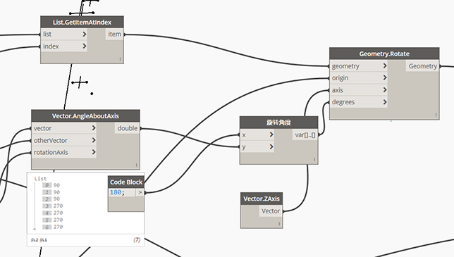再次使用索引命令,将梁线选取,在使用180-角度的方式计算改旋转角度,保证墙体再倾斜状态下能够与墙体保证平行。通过Geometry.Rotate节点进行旋转应用得到与墙体平行位置的梁线,到这一步所有的梁线处理完毕,下一步进行构件的匹配。