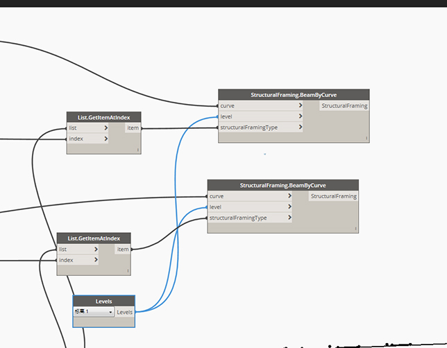 再次使用List,GetItemIndex节点进行排序选取,使梁线对应的构件名称能够正确对应,标高通过Levels进行选择,最后通过StructuralFraming.BeamByCurve节点进行过梁的创建和放置。本次的讲解针对的其中一组数据,剩余的三组数据采用相同的方式进行归类整理,就可以通过Dynamo创建整个项目的门窗过梁。