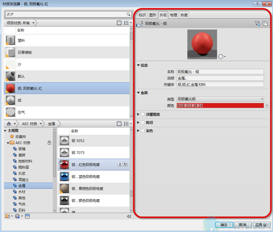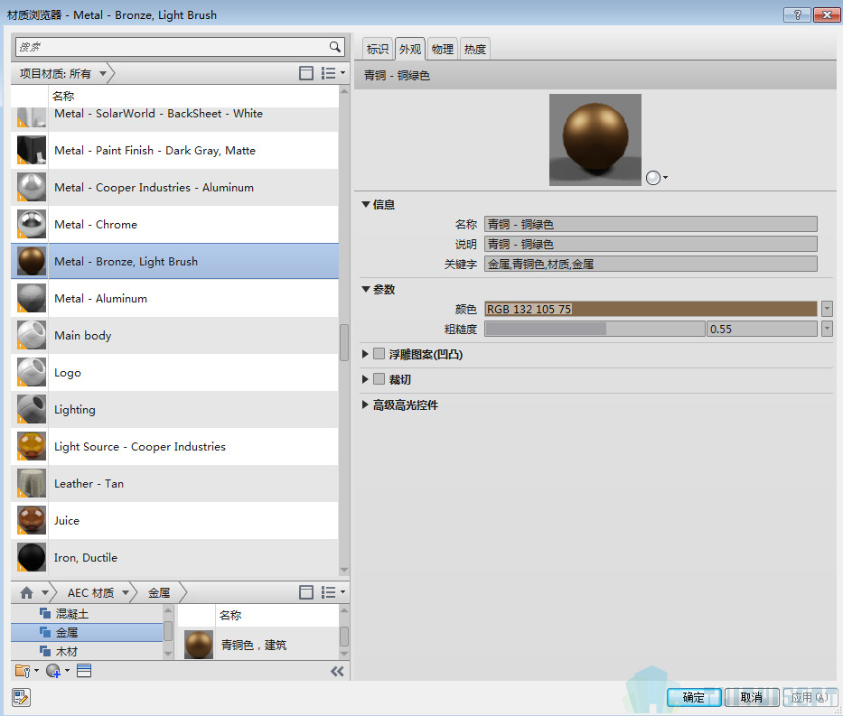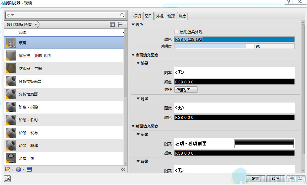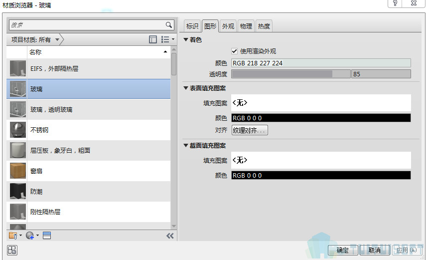 在Revit LT中材质编辑器面板是不会显示包含在Revit中的物理或热的选项卡。