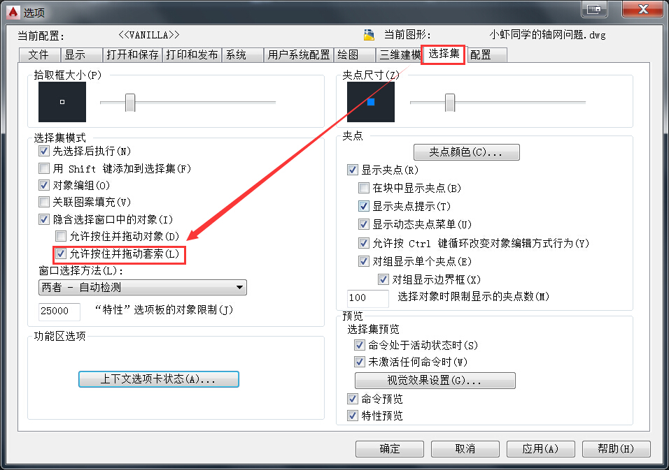 选项里-选择集栏目-把红色框框部分 “允许按照并拖动套索”前面的勾去掉就有了!