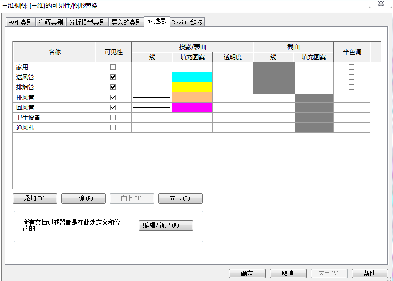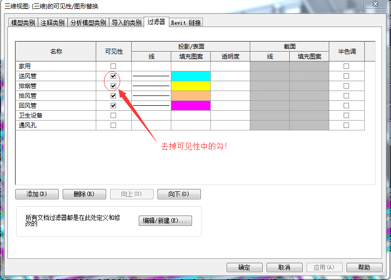 如图3过滤器所示该项目暖通专业由:送风管;排烟管;排风管;回风管四种管道系统组成,如果四种管道都显示就会造成上述问题。